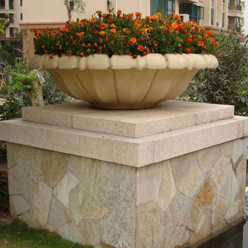 The sandstone flower pot in round shape like a flower. The beige sandstone is suitable for the exterior application. And is more soft and will be good to produced in any shape. We can produce it exactly according to your drawings.Contact us for more details.