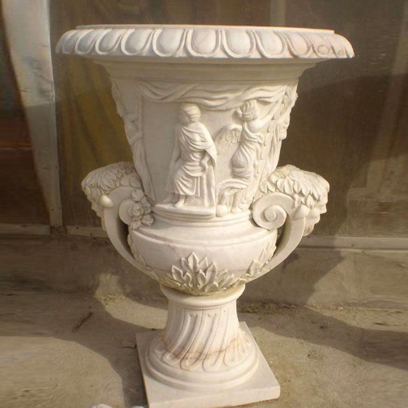 This white marble flwoer pot is designed in a wine glass shape and you can see the detailed statue on on it also. The white marble materila and the design make them looks much more elegent. It will bring more beauty to your garden. Size and design can be customize according to your request.