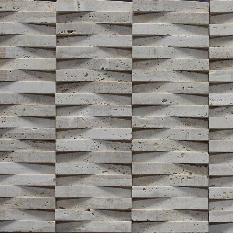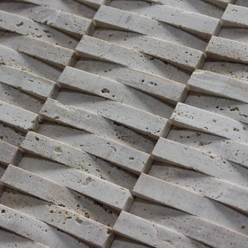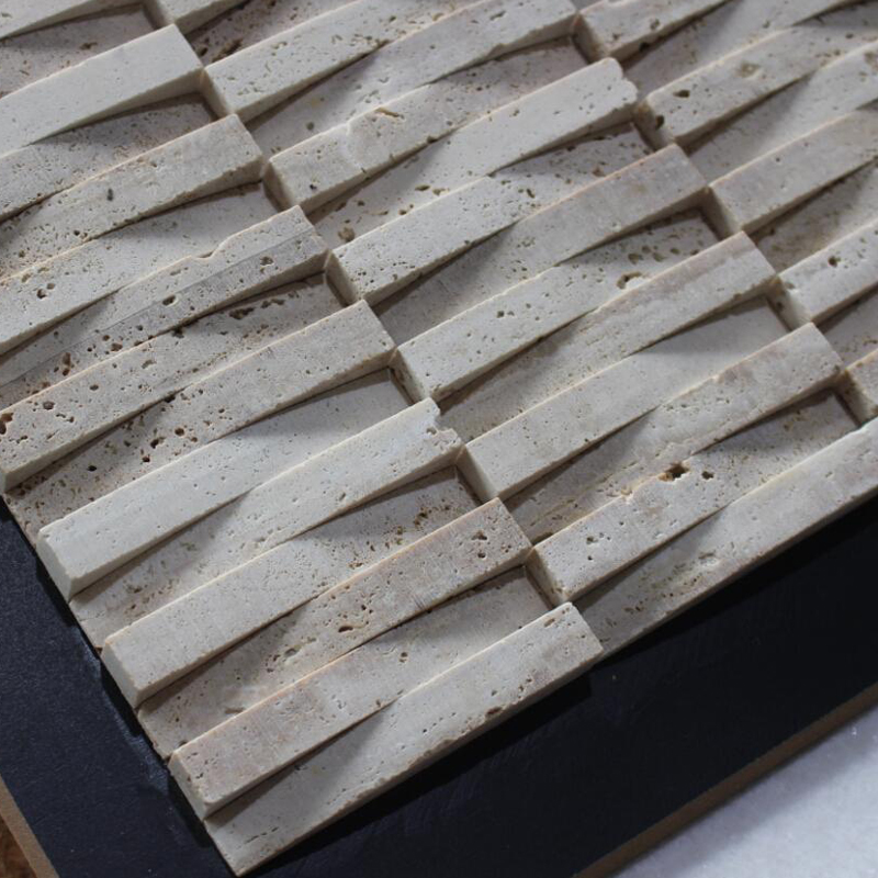 Beige 3d travertine mosaic tiles in strip shape, upper and lower position are jointed and folded.The 3d mosaic tile form a lattice in a crisscross pattern with the strips. It will be a special landscape on your home decoration.